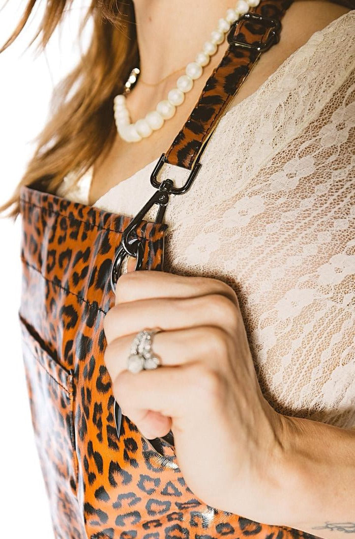 Made from durable and lightweight leopard print vegan leather, it features decorative pearlesque beads with silver chain embellishment and slit up the leg are for added flair. The apron is comfortable to wear with easy waist side ties and does not restrict your movement. It is designed to fit snugly around your waist and features adjustable buckle strap for a customizable fit.