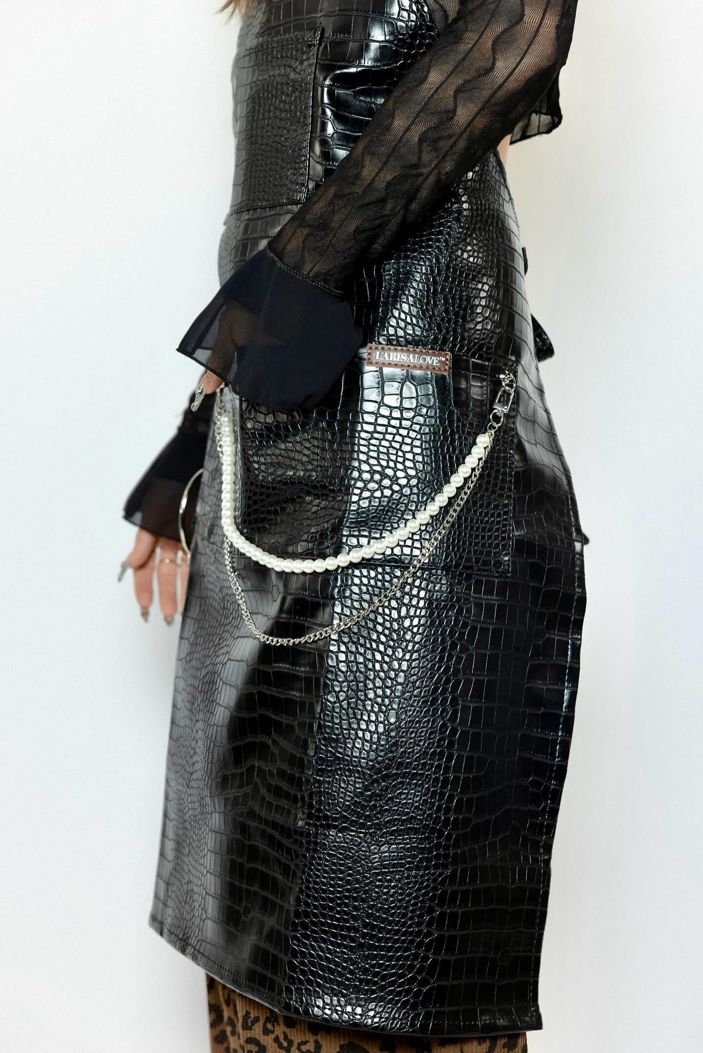 Made from durable and lightweight vegan leather with black crocodile texture, the apron is comfortable to wear with easy waist side ties and does not restrict your movement. It is designed to fit snugly around your waist and features adjustable buckle strap for a customizable fit. Features decorative pearlesque beads with silver chain embellishment.
